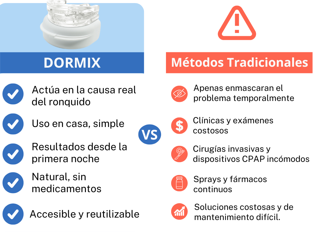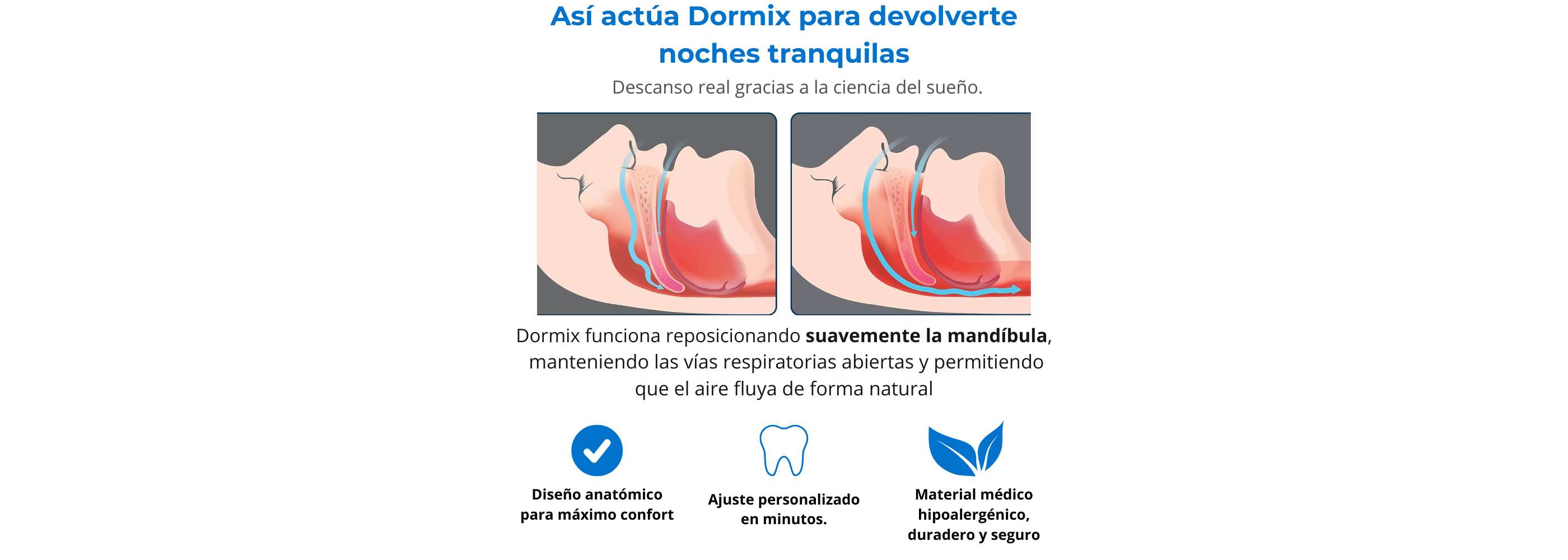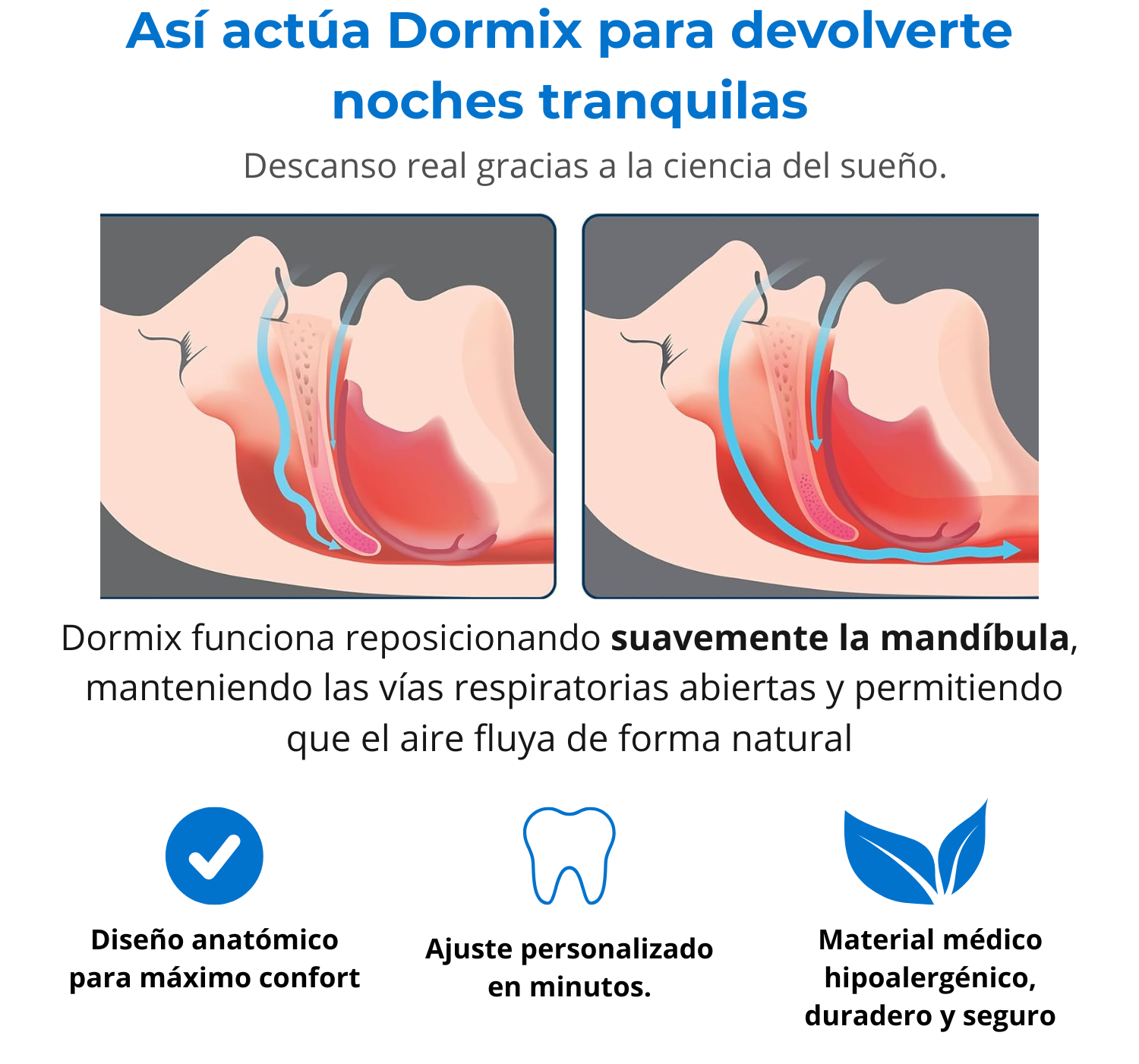 Dormix reposiciona suavemente la mandíbula para mantener las vías respiratorias abiertas, permitiendo que el aire fluya de forma natural y reduciendo el ronquido desde la primera noche.
